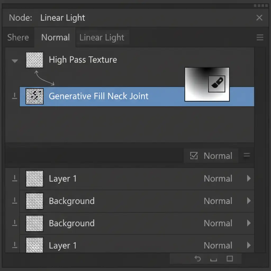 - Create a Clipping Path by holding Alt/Option and clicking between the High Pass layer and the Generative Fill layer. This forces the texture to only appear inside the AI neck joint.