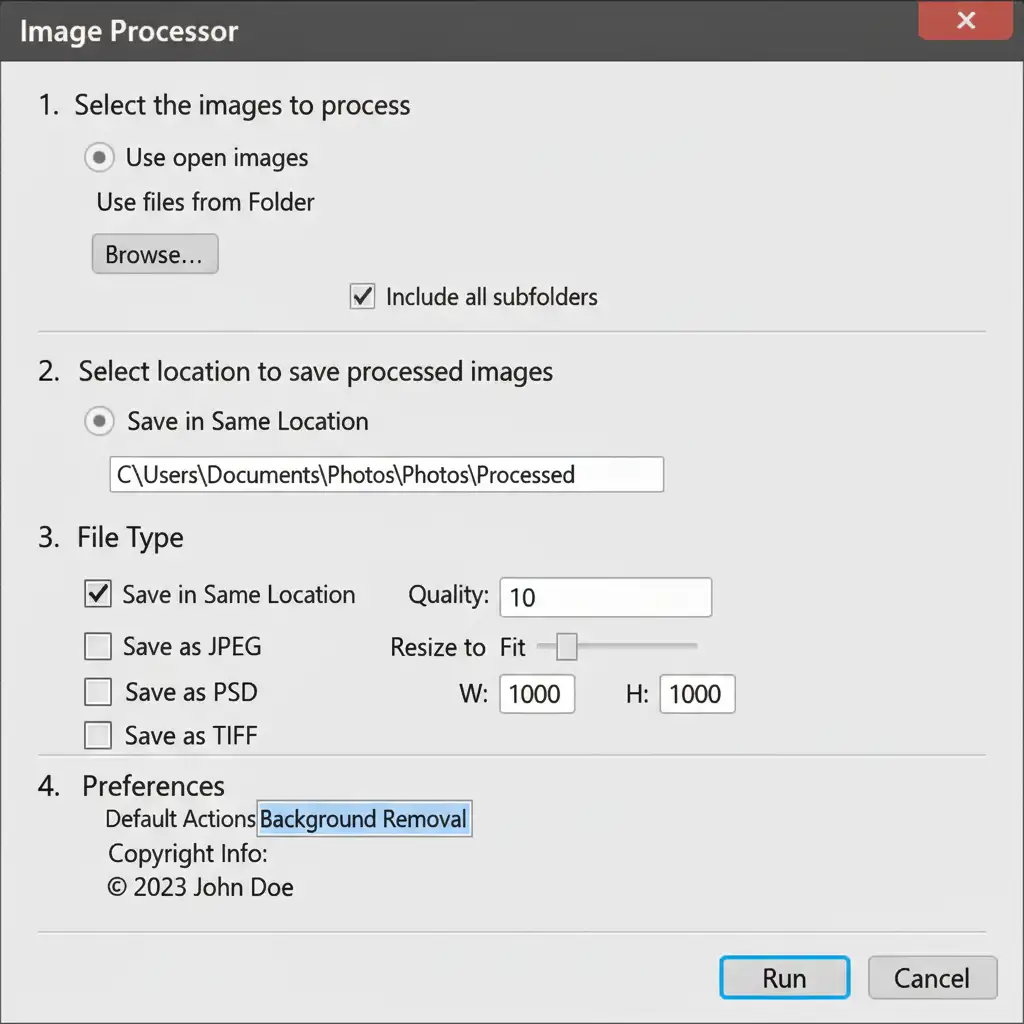 If you have images of varying sizes and formats, the standard Batch tool can sometimes struggle with save dialogs. The Image Processor is a built-in script designed specifically for handling bulk resizing and format conversion while simultaneously running an Action.