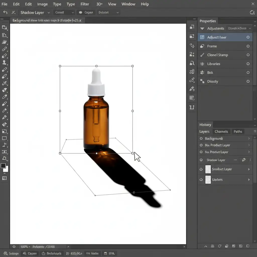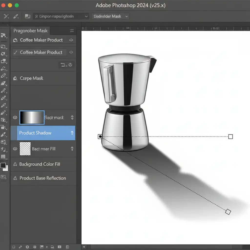- Add a Layer Mask to the shadow layer. Use the Gradient Tool (Black to Transparent) to create a seamless falloff, making the shadow fade naturally as it moves further from the product base.
