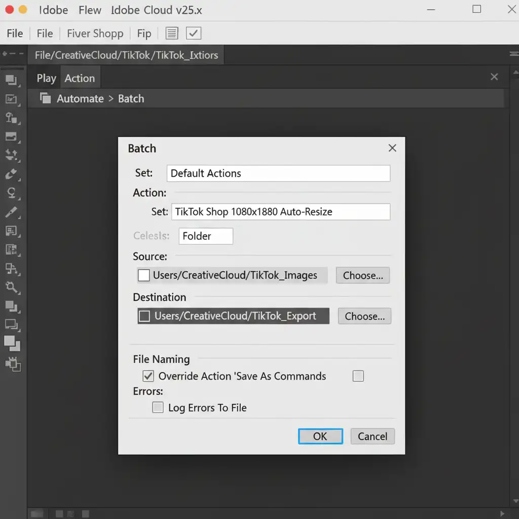 Record a master action that utilizes the Select Subject tool for background removal, aligns the garment, and auto-resizes the canvas to TikTok Shop’s mandatory 1080x1080px ratio. Once recorded, you can apply this to entire folders of pre-shot garments.