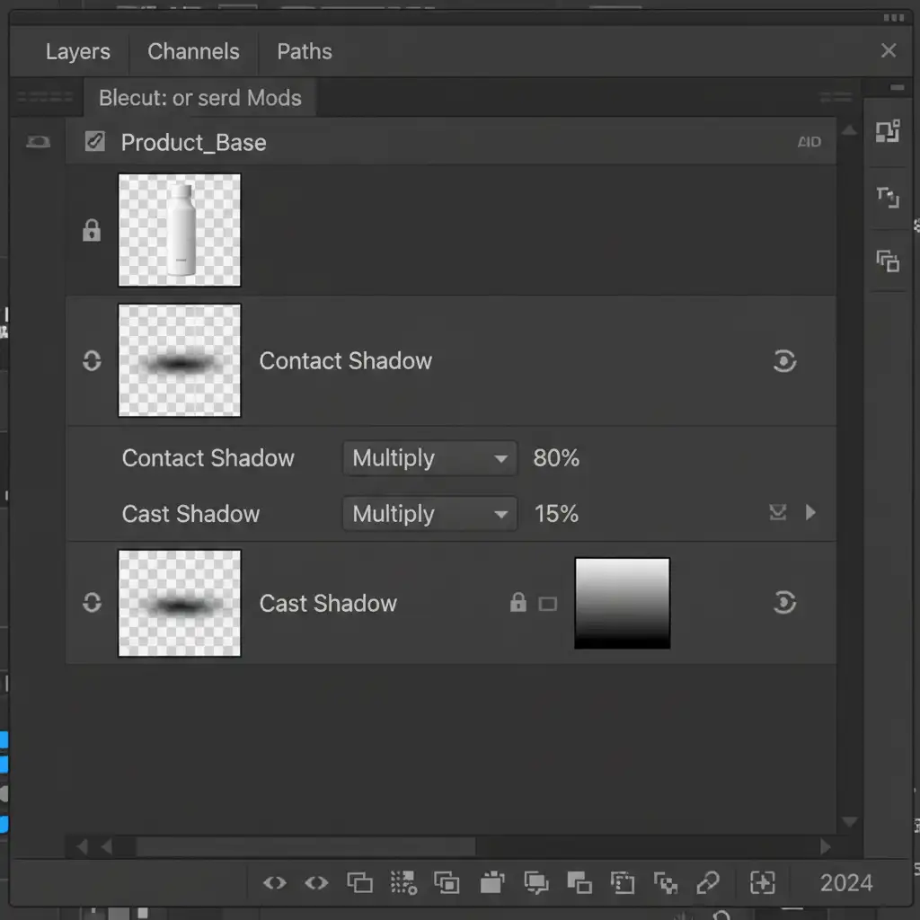 - Fade with a Mask: Add a layer mask to the elongated cast shadow layer. Use a linear gradient on the mask to naturally fade the shadow as it gets further away from the product base.