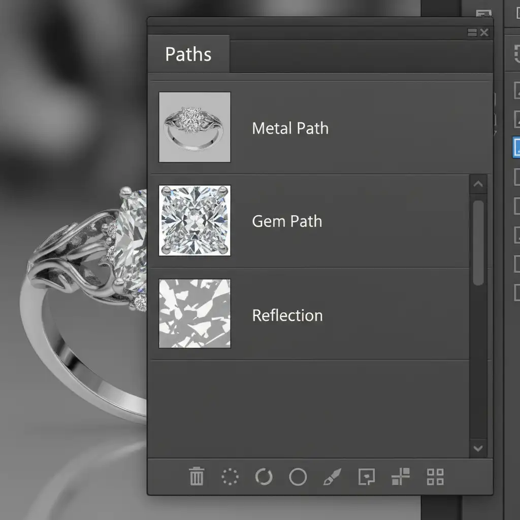 By keeping these paths separate in the Paths panel, you can convert them into individual selections. You can then apply a layer mask to each specific zone, allowing you to independently color-correct the metal, sharpen the diamonds, and blend the natural reflection into a new background without having to rasterize destructive changes.