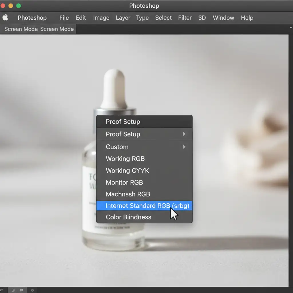 - Go to View > Proof Setup > Internet Standard RGB (sRGB).