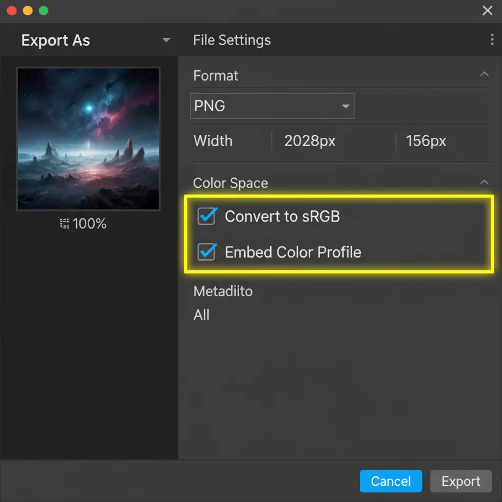- Ensure both Convert to sRGB and Embed Color Profile are strictly checked.