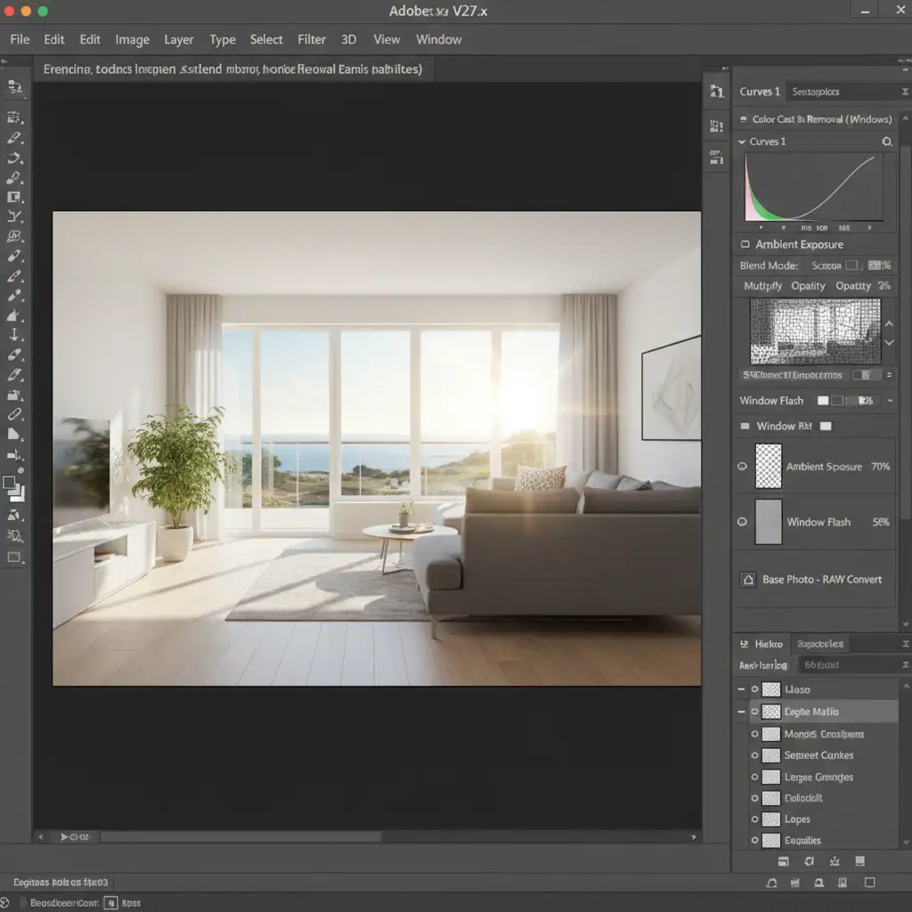 - White Balance Adjustment: Correct the mixed lighting (e.g., tungsten interior lights clashing with daylight from windows) to reflect the true color of the room.