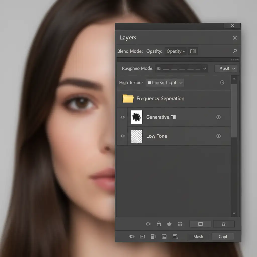 - Run your standard Frequency Separation action to split your image into a High (Texture/Sparkle) layer and a Low (Color/Tone) layer.