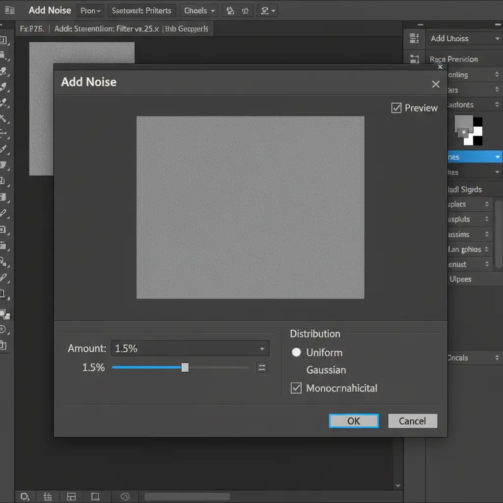 - Set the distribution to Uniform, check Monochromatic, and set the amount to 1-2% (match this to your camera’s natural ISO noise).