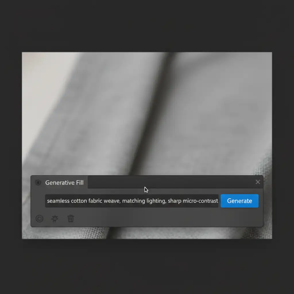 Step A: Precise Prompt Engineering Never leave the Generative Fill prompt blank when doing ghost mannequin neck joints. Blank prompts force the AI to guess. Instead, use specific textile descriptors.