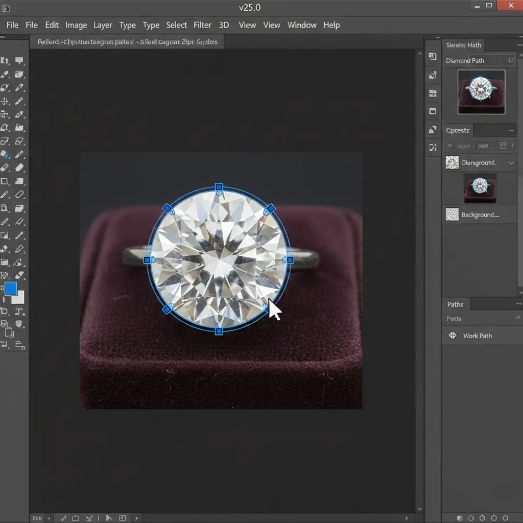 - Draw a precise vector path tightly hugging the diamond’s girdle and crown. Do not use the Object Selection tool; it is not accurate enough for high-end jewelry.