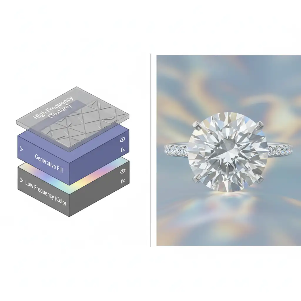 If you need to use Generative Fill to alter the color or tone behind a transparent gem without destroying its surface texture, frequency separation is your best tool.