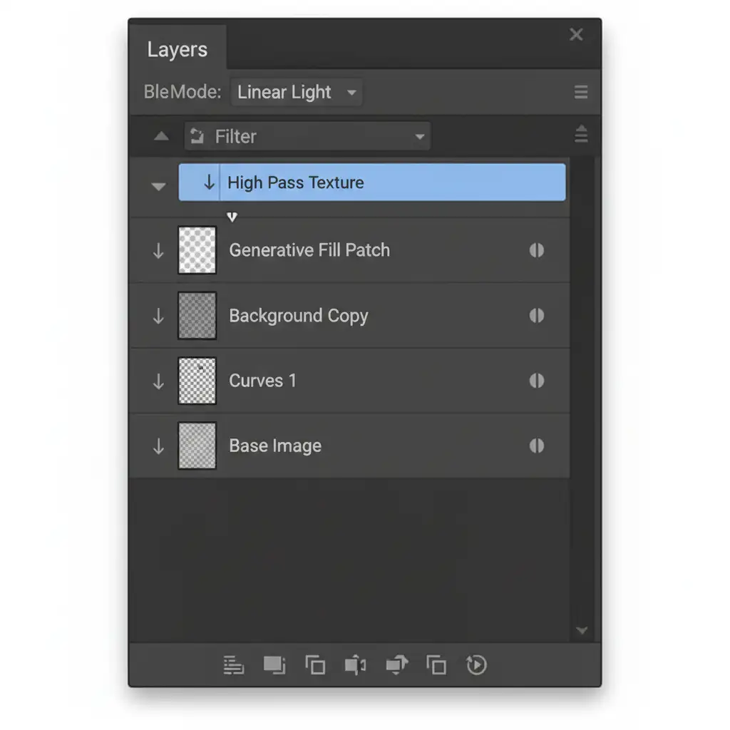 - Change the blending mode of your High Pass texture layer to Linear Light blending. This drops out the neutral gray and applies only the sharp texture.