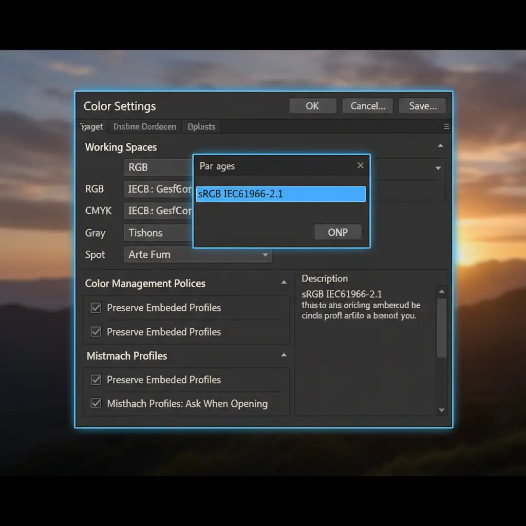 - Ensure your RGB working space matches your intended output or document profile (for standard web and digital use, select sRGB IEC61966-2.1).