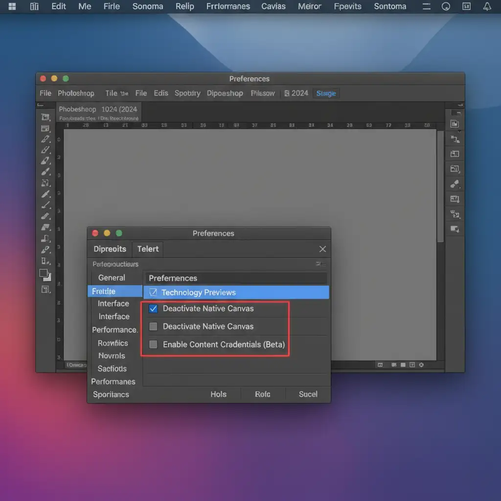 Native Canvas is a modern rendering feature designed to improve UI performance, but it is currently the primary source of friction with macOS Sonoma. Disabling this forces Photoshop to rely on its older, vastly more stable rendering engine.