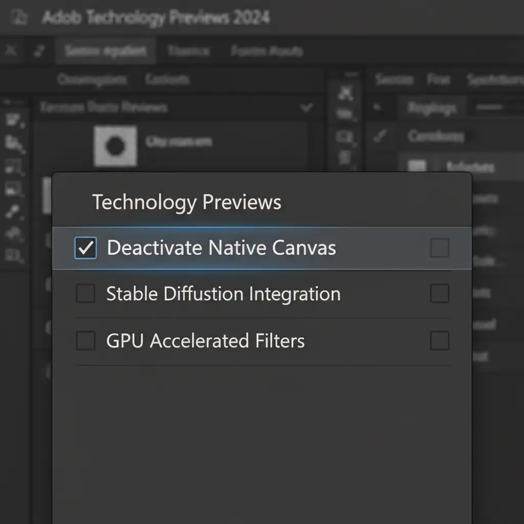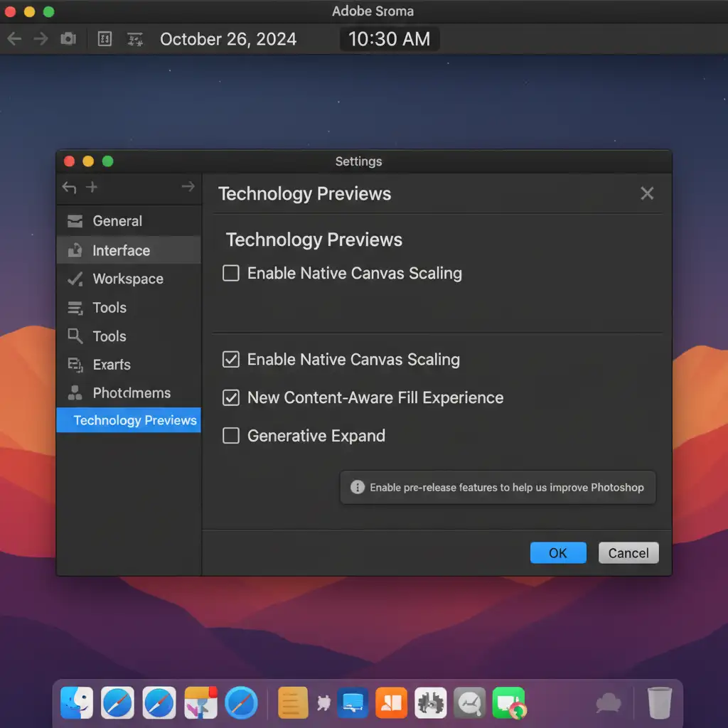 - Navigate to the top menu bar: Photoshop > Settings > Technology Previews.