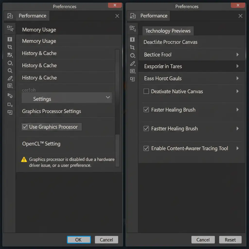 Disabling these features forces Photoshop to rely on CPU rendering, which bypasses the Native Canvas glitch causing the jagged borders during bulk image processing.