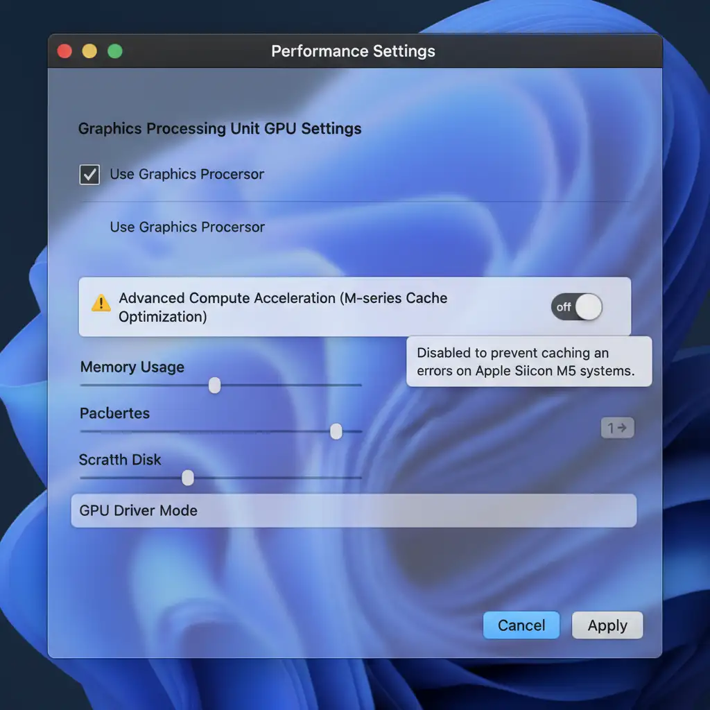 1. Adjust M5 GPU Acceleration Settings Apple Silicon M5 caching errors can disrupt the AI processing pipeline. You need to force a reset of the graphics processing parameters.