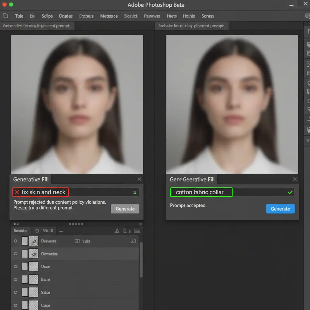 This frustrating bottleneck is a common pain point for professional studios editing swimwear, lingerie, or standard neck joints. Adobe’s strict AI safety protocols frequently misinterpret innocent skin-to-clothing transitions as inappropriate content, completely derailing production timelines.