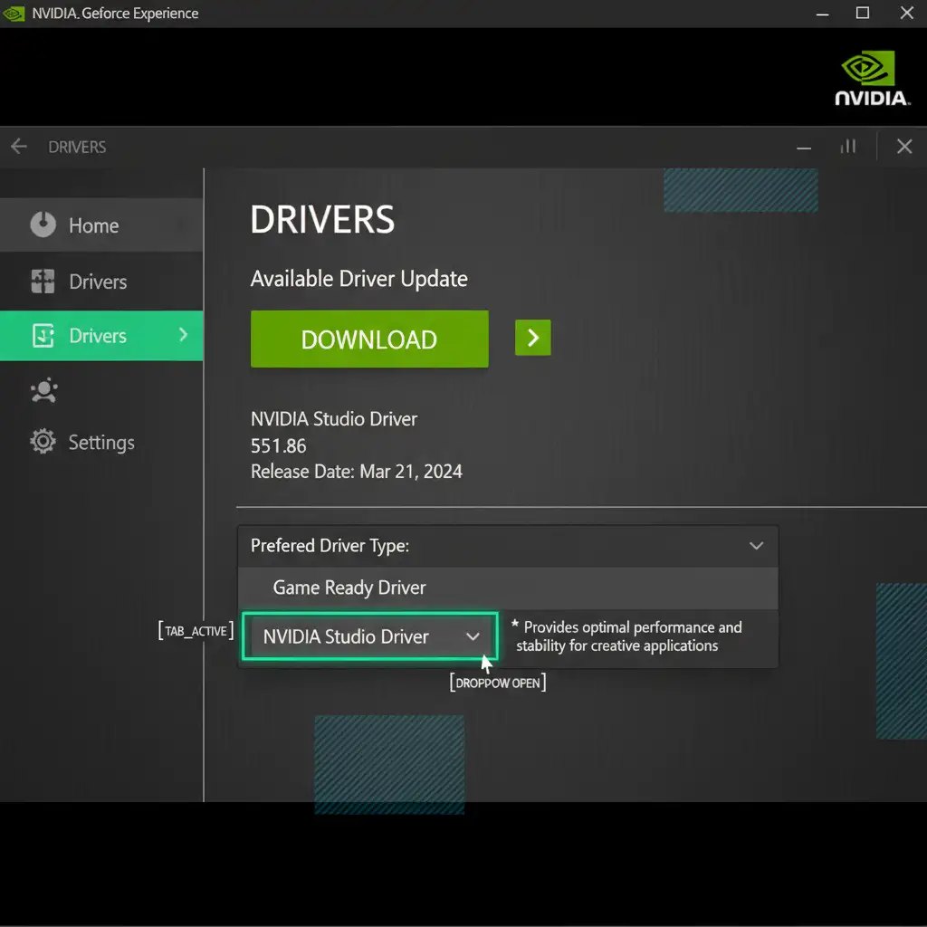 - Click the three vertical dots (or preferences menu) and switch your driver preference from “Game Ready Driver” to NVIDIA Studio Driver (or PRO Edition for AMD). Download and install the latest version.