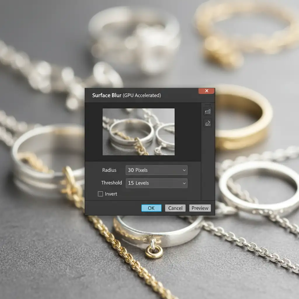 For high-end commercial jewelry catalogs, editors rely on the Surface Blur technique. This method targets flat and subtly curved metallic surfaces, obliterating polishing marks while strictly protecting the complex geometry of prongs, gemstone facets, and anisotropic highlights.