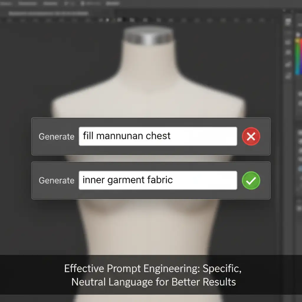 When you attempt to fill the back of a collar or edit a swimsuit, the AI analyzes the garment’s shapes, shadows, and the text in your prompt. If it detects shadows that mimic body contours, or if you use anatomical terms like “chest,” “skin,” or “bust,” the system triggers a false-positive AI filter. This instantly locks the Contextual Taskbar, stopping your e-commerce retouching dead in its tracks.