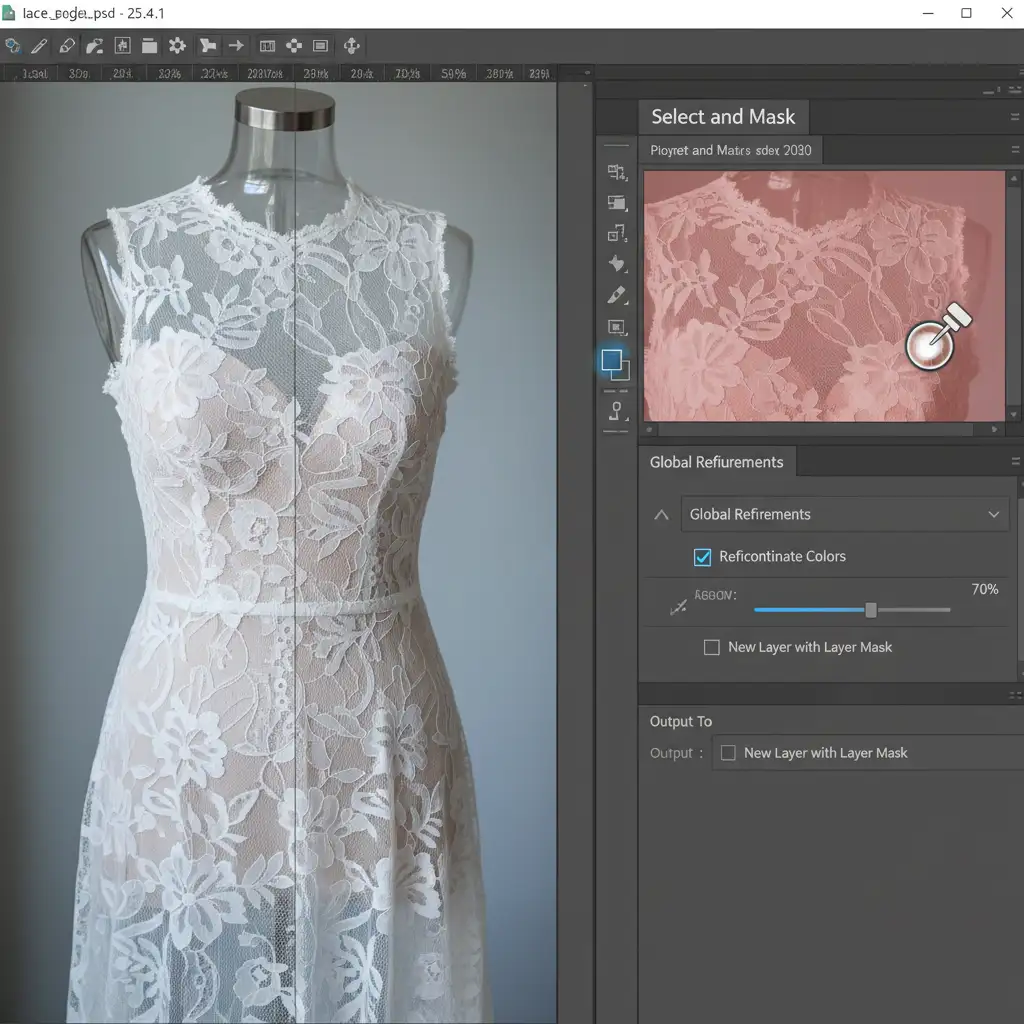 If you are dealing with a garment that has solid edges but lace trim, the Select and Mask workspace is your first line of defense.