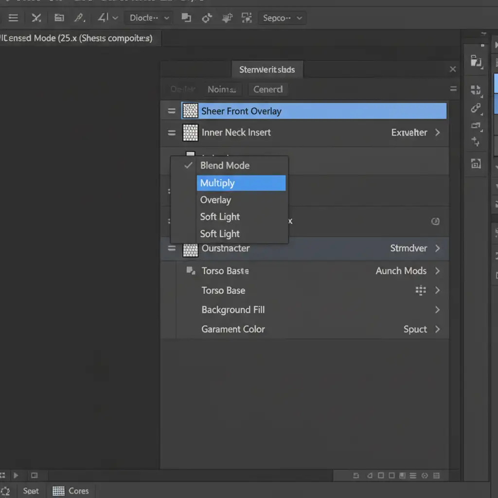 Compositing the Inner Neck: Once the front of the garment is masked, you must composite the inner back neck (the insert shot). To ensure the sheer fabric overlays the inner label naturally without looking pasted on, place the inner neck layer below the front garment layer. Then, change the front garment’s layer blend mode to Multiply. This forces the sheer texture to interact realistically with the label beneath it.