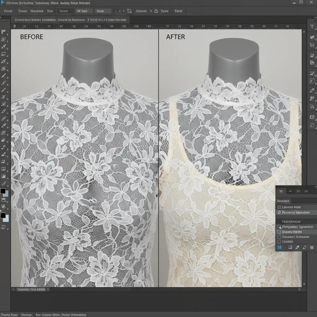 When dealing with the most difficult sheer fabrics—where the mannequin’s skin tone or plastic color heavily contaminates the mesh—you must separate the garment’s texture from its color using Frequency Separation.