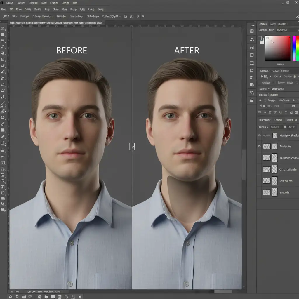 - Paint Ambient Occlusion: Set this new layer’s blending mode to Multiply. Select a soft brush with low opacity and paint a soft black gradient inside the collar. This simulates ambient occlusion and a realistic drop shadow, giving the garment a true 3D hollow appearance.