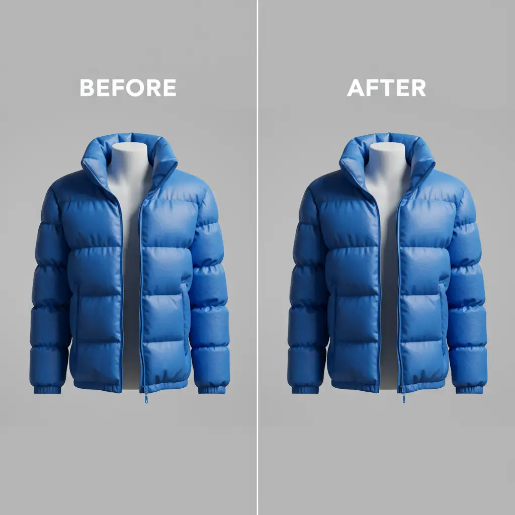 The core technical pain point in heavy outerwear retouching happens during the neck joint composite phase. When you combine the front shot of the jacket with the inside back-collar shot, the natural lighting is disrupted. The down-filled ridges lose their dimensional highlights and shadows, flattening the entire garment.