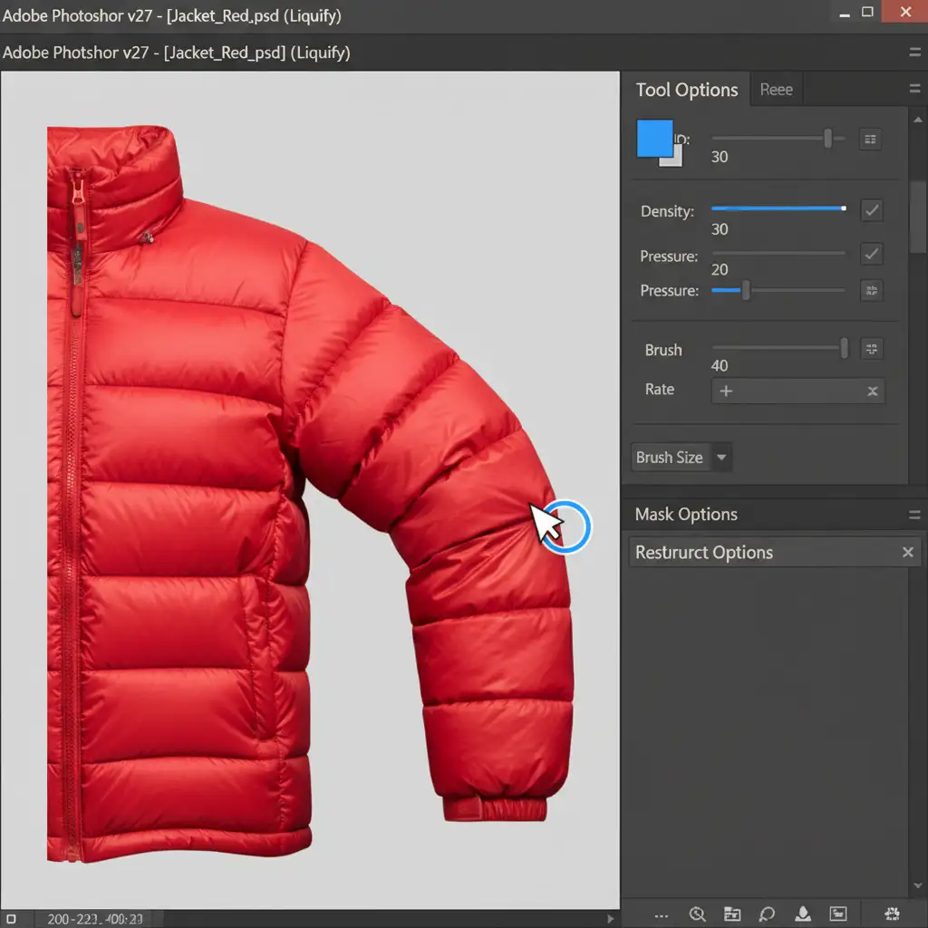 When a down jacket is photographed flat, the edges of the baffles often compress inward. While some editors attempt to use Puppet Warp to stretch the garment, it often distorts the fabric texture. The superior method is using Photoshop’s Liquify tool.