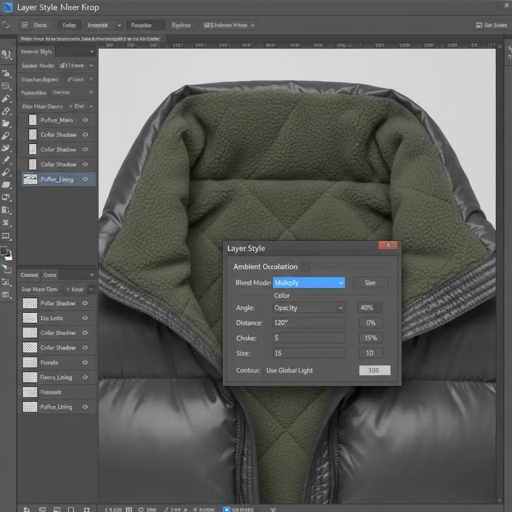 - Set the blend mode to Multiply, choose a dark tone sampled from the jacket’s natural shadows, and adjust the distance and size.