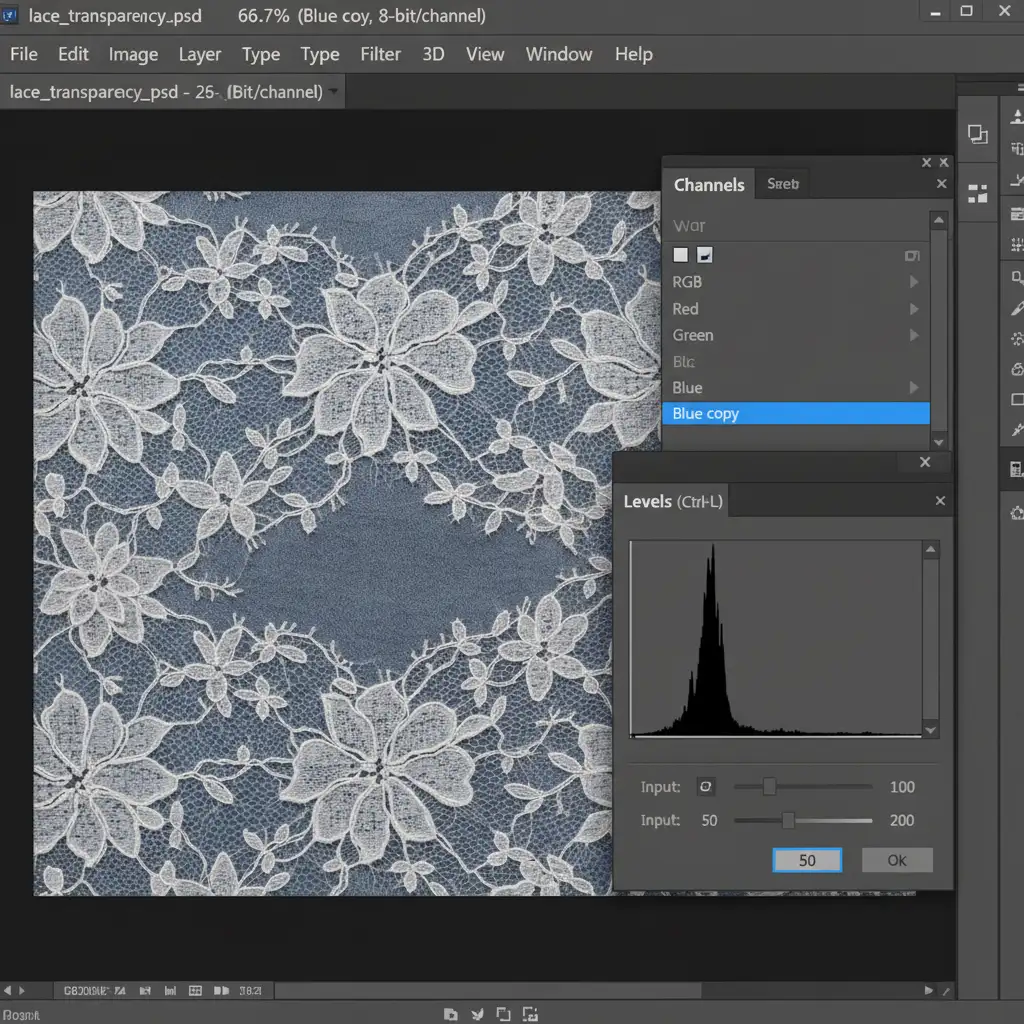 - Apply Levels (Ctrl+L / Cmd+L) to this duplicated channel. Push the darks darker and the whites whiter, being incredibly careful not to lose the mid-tone transparency of the lace.