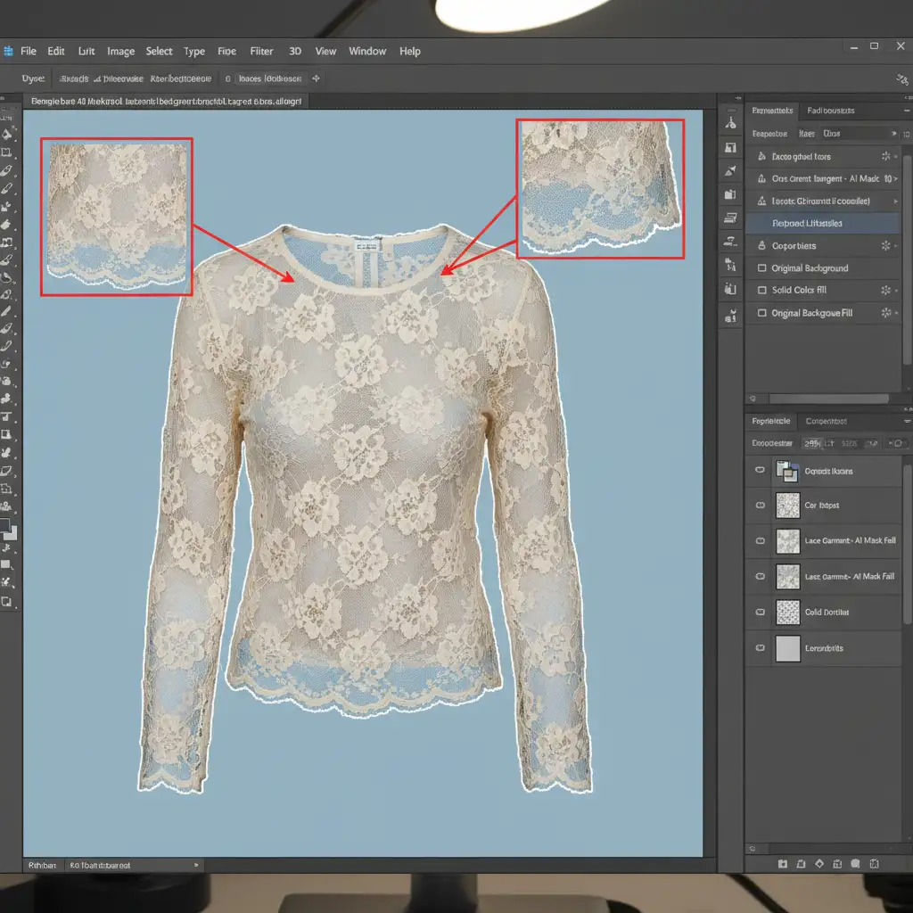 To achieve the ultimate pixel-perfect ghost mannequin service for sheer lace garments, you must combine vector precision with raster transparency. This is the multi-pass compositing method.
