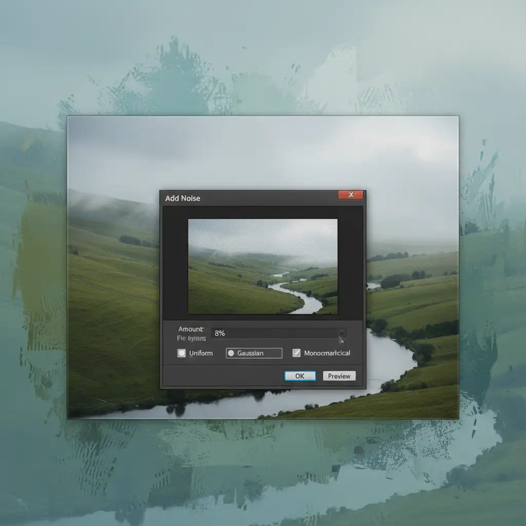 - Adjust the amount and distribution (Uniform/Gaussian) to match the original photo’s grain.