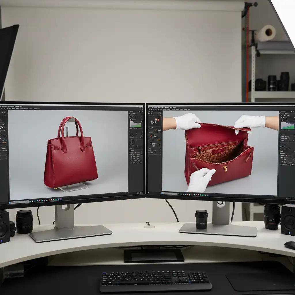 Removing these supports via basic background removal leaves a gaping, unnatural hole where the interior lining should be. The technical workflow to fix this requires merging an exterior “hero” shot with a separate inner lining shot. However, retouchers frequently run into pain points like lighting mismatches between the two exposures, misalignment of hardware, and the loss of natural shadows that define the item’s rigidity.