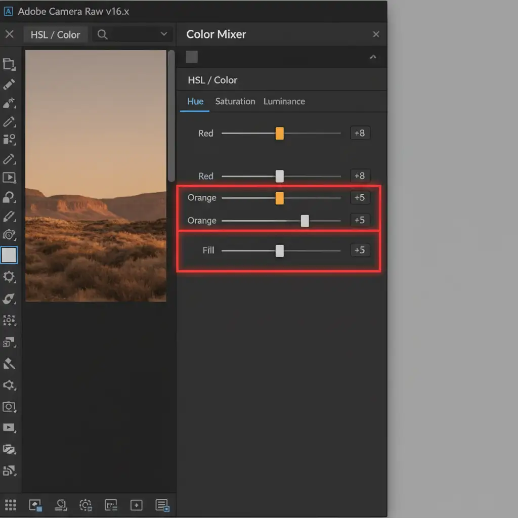 - Select the Hue tab. Gently shift the Reds and Oranges sliders slightly towards yellow (usually between +5 to +12, depending on the lighting).