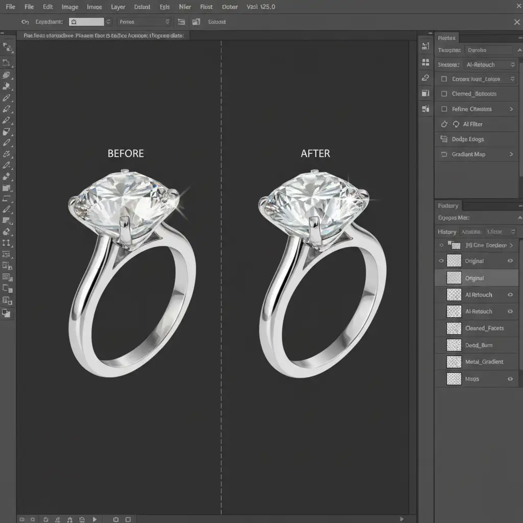 The result is “AI mud”: warped gemstone facets, destroyed linear gradients on metallic bands, and specular highlights that morph into dull smudges. If you want to maintain your brand’s luxury appeal, mastering jewelry retouching AI artifact repair is no longer optional—it is a critical workflow requirement. Here is exactly how to restore structural integrity to your AI-edited jewelry photography.
