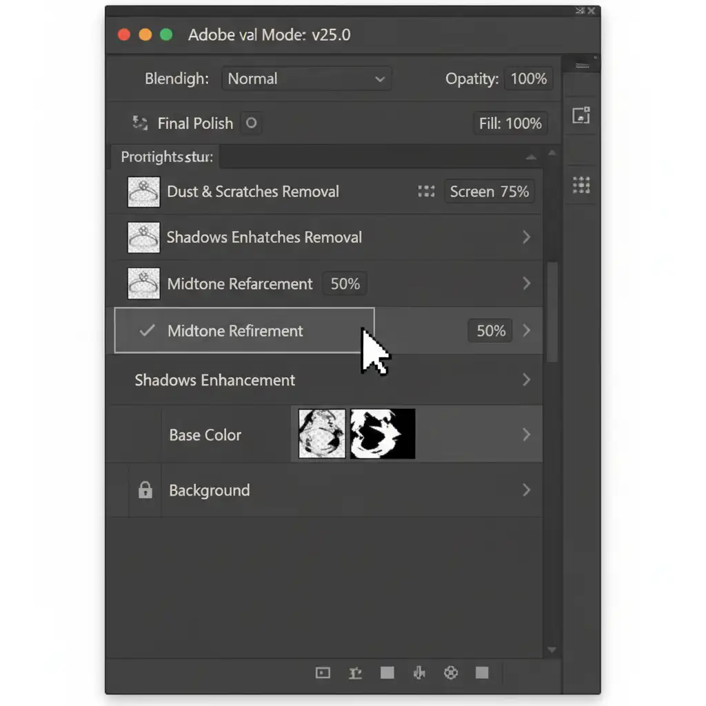 - The crucial step: AI tools often leave mismatched noise profiles, making your smooth vector repair look fake. Create a new layer above your repair, fill it with 50% gray, and set the blending mode to Overlay.