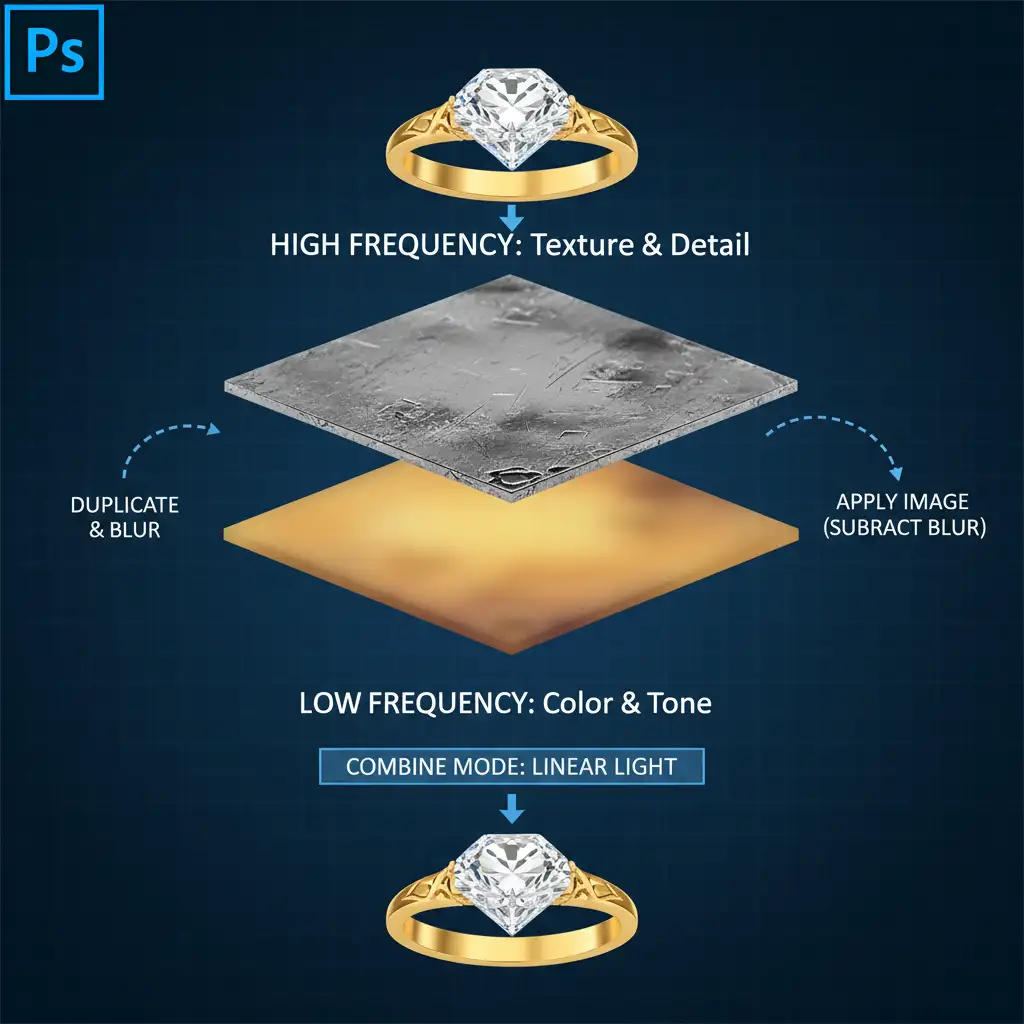 When generative AI destroys the smooth gradients of a metallic band, resulting in ugly gradient banding and warped reflections, frequency separation is the industry-standard rescue tool. This separates your image into two distinct layers: color/tone (Low Frequency) and texture (High Frequency).