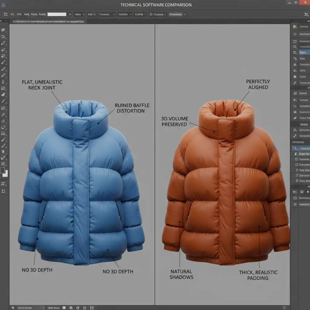 E-commerce photo editors know the struggle: you finish a flawless clipping path on a heavy winter coat, drop in the inner collar, and suddenly, the garment looks completely flat. Standard ghost mannequin techniques destroy the volumetric depth of padded down baffles, resulting in a disjointed, unrealistic transition between the back-neck area and the puffy front shell.