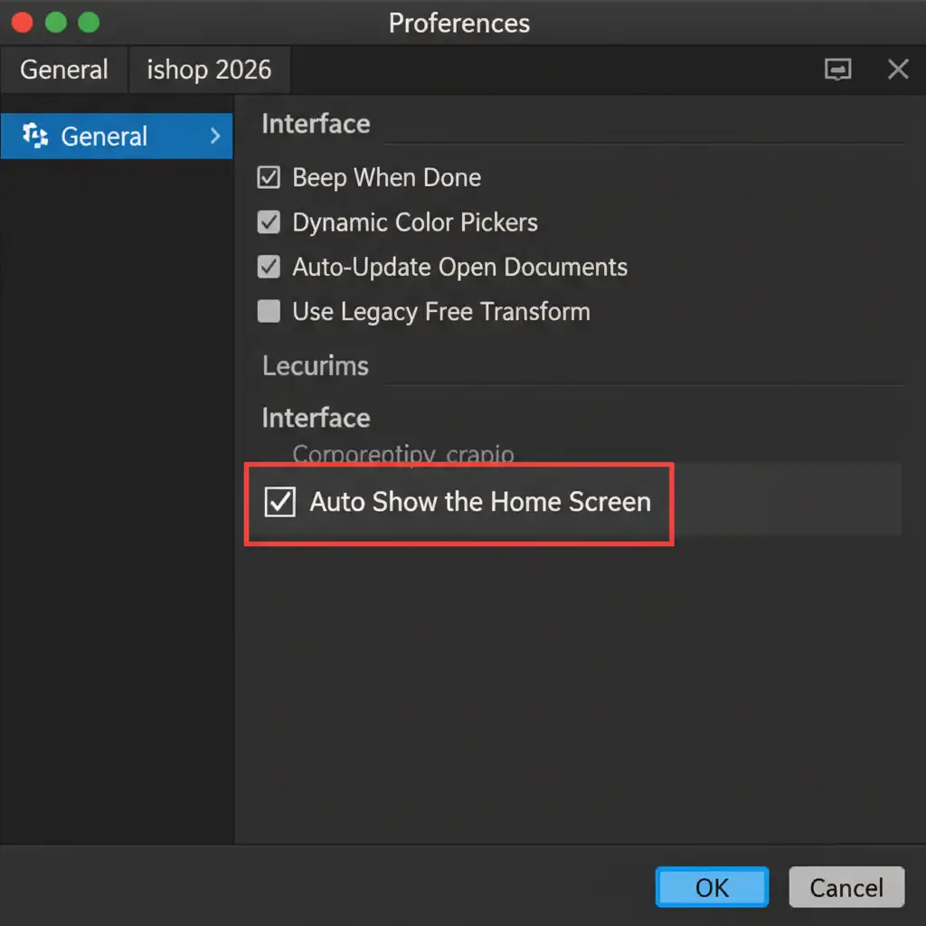 The easiest way to stop Photoshop from verifying cloud assets and stalling the Dynamic Link is to disable the Home Screen. This prevents the software from attempting to load the heavy start workspace during the handoff.