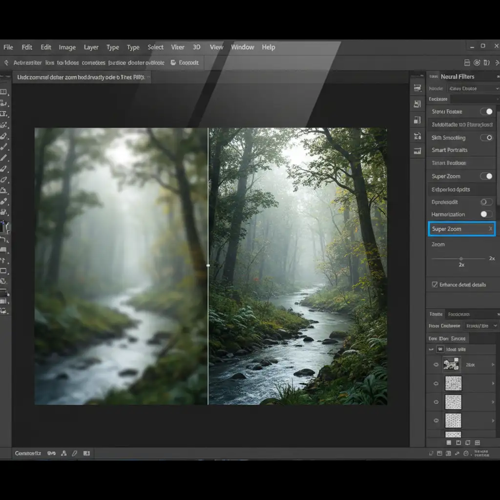 - Toggle on Neural Filters Super Zoom. Use this AI upscaler to computationally enhance and sharpen the blurry chunk, adding back lost structural details.