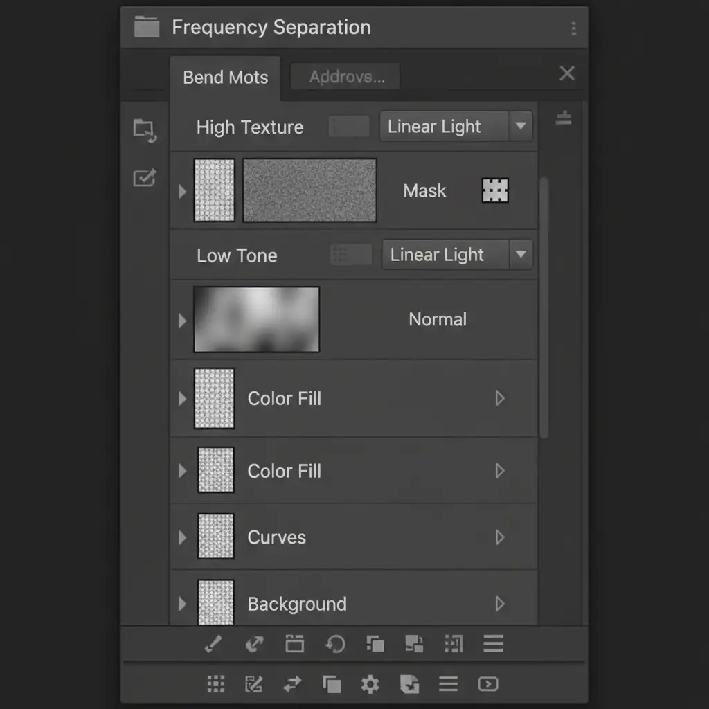 For high-end beauty and commercial retouching, Frequency Separation is the gold standard. This technique separates your image into two distinct layers: High-frequency texture (pores, eyelashes, iris details) and Low-frequency tone (color, shadows, and the bright white tones of the glare).