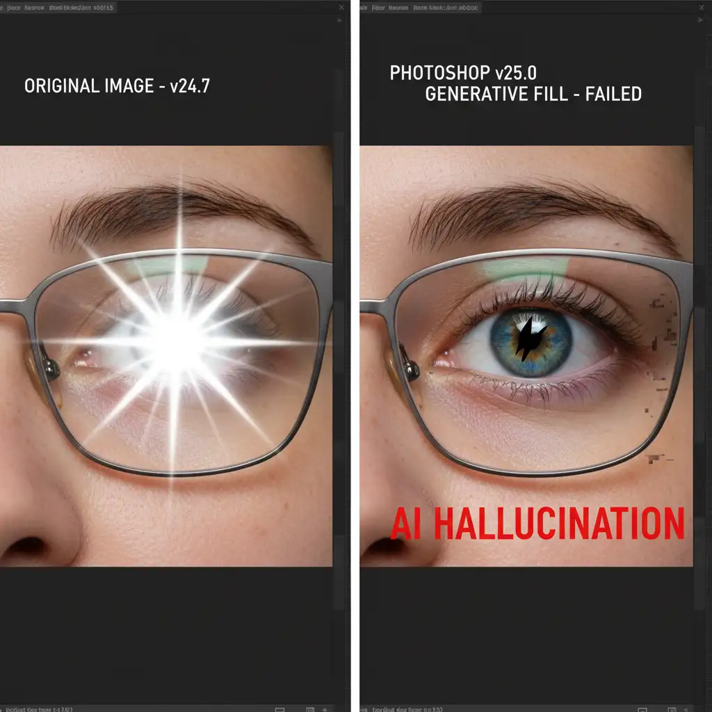 When you use Generative Fill to remove a bright reflection, the algorithm doesn’t just erase the superficial white glare. Instead, it attempts to synthesize an entirely new eye based on its training data. Because it cannot accurately calculate the refractive index of the glass or match the exact micro-texture of the subject’s original eye, the result is a warped, “dead” looking eye.