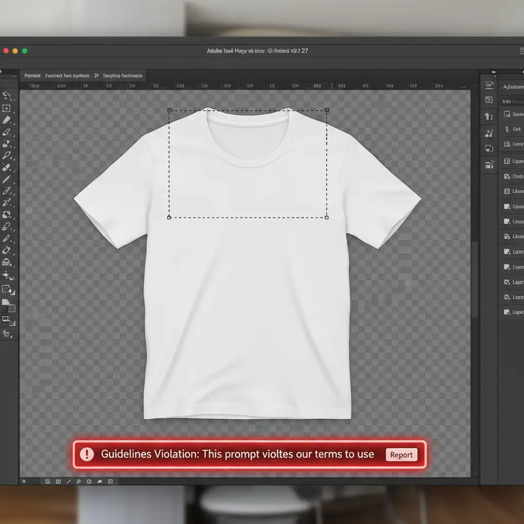 You are editing a batch of e-commerce apparel. You select the hollow neck area to create a seamless ghost mannequin effect, click Generative Fill, and BAM—a red “Guidelines Violation” error stops you dead in your tracks. Why is Adobe Firefly flagging a simple cotton t-shirt?