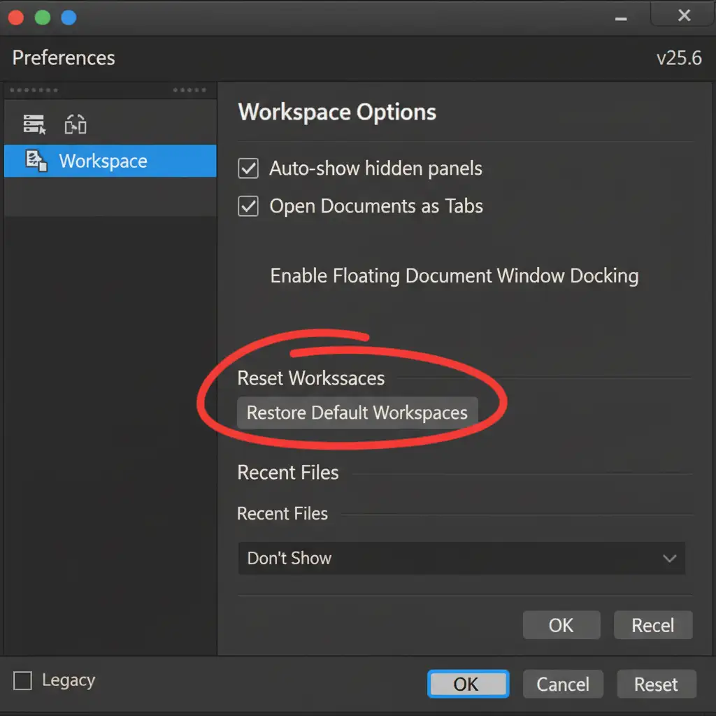 If the Photoshop Generative Fill taskbar missing v25.6 issue persists, the underlying Photoshop Preferences may be corrupted. You will need to restore the default workspaces from the settings menu.
