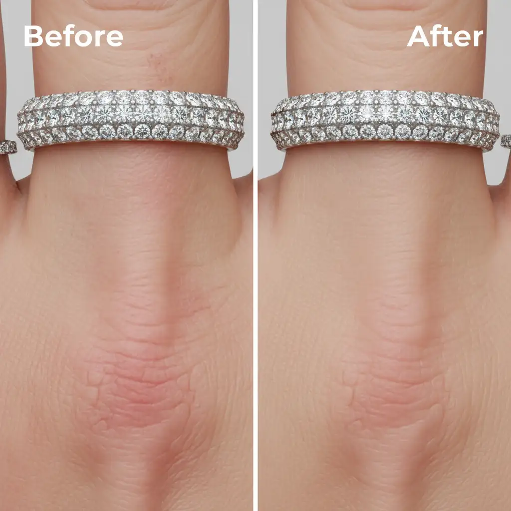 When editors try to remove wrinkles or distracting knuckle folds from a hand displaying a ring, standard healing or blurring destroys the micro-texture. High-end jewelry photography demands hyper-realistic skin to maintain the luxury feel of the product.