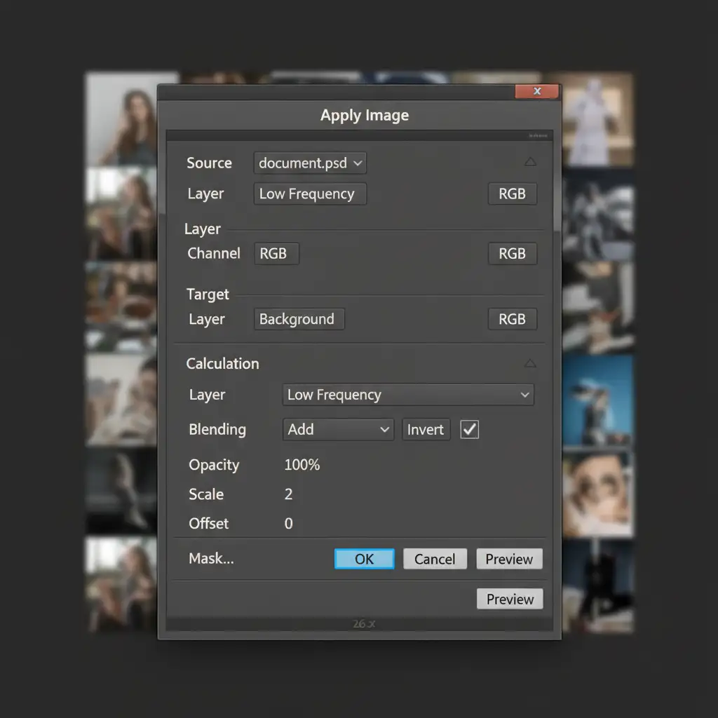 - Select the High Frequency layer and open the Apply Image math dialog.