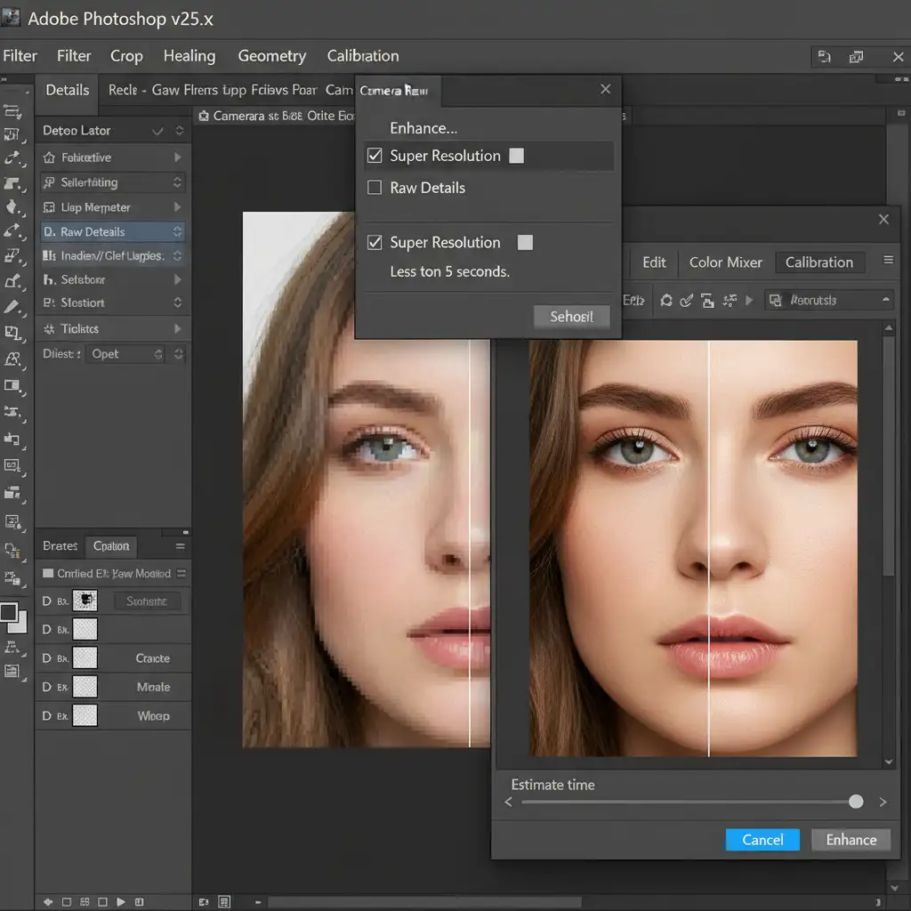 Your first goal is to give Photoshop enough pixels to work with. If you try to retouch a 72dpi image, you will end up with a blurry, plastic-looking result. We need to double the pixel count using AI upscaling.