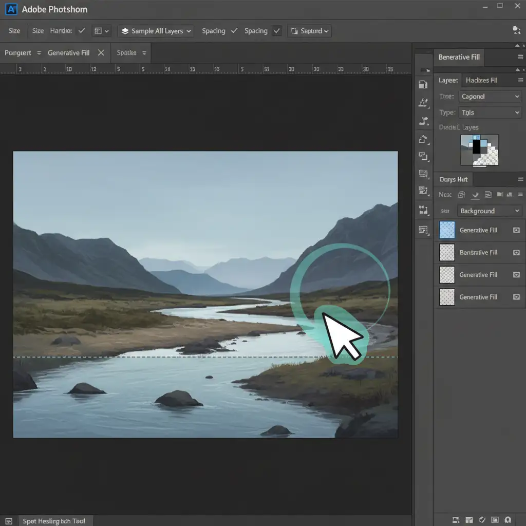 - Clean the Boundary: Create a new blank layer above your Generative Fill layer. Select the Spot Healing Brush Tool and ensure the “Sample All Layers” checkbox is ticked in the top options bar.